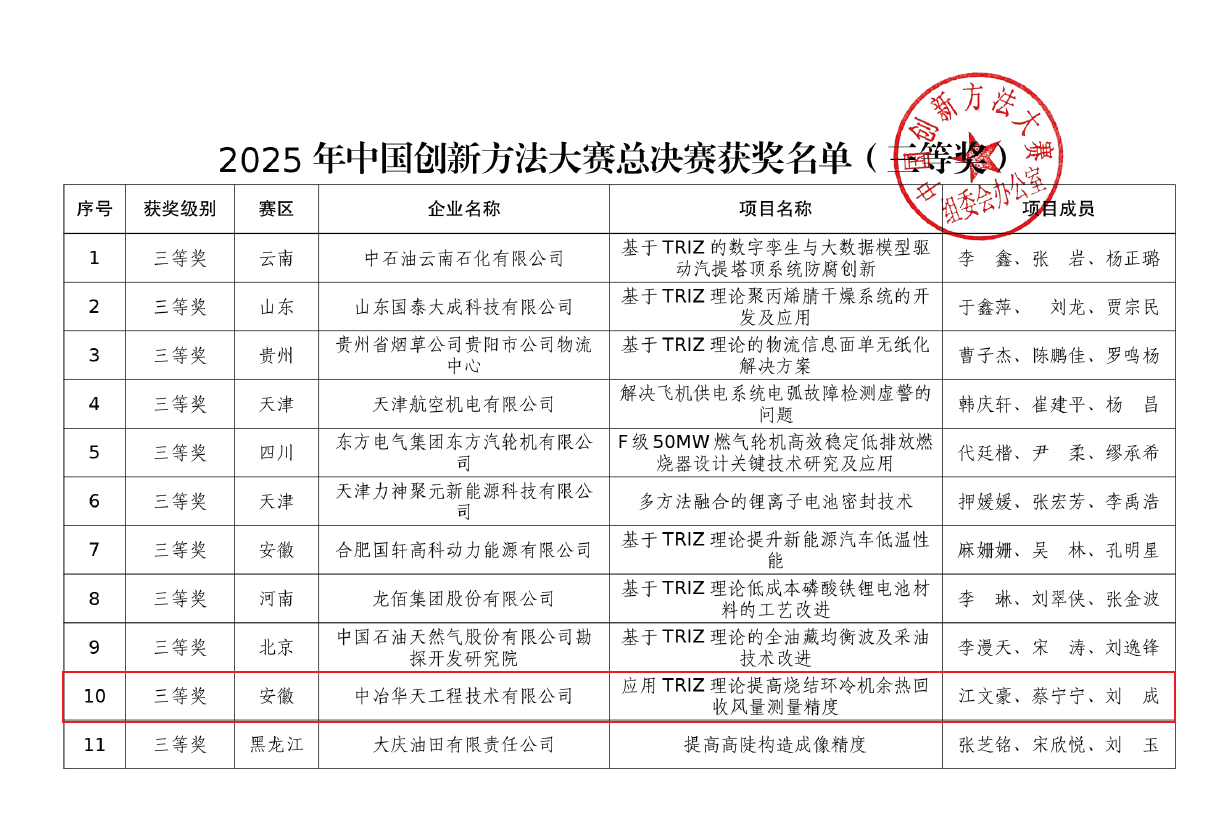 11月17日至21日,2025年中国创新方法大赛全国总决赛在山东泰安和济南举办,利来国际(中国)参赛作品《应用TRIZ理论提高烧结环冷机余热回收风量测量精度》斩获三等奖,充分展现了利来国际(中国)积淀深厚的创新底蕴和利来国际(中国)员工昂扬奋进的创新风采。