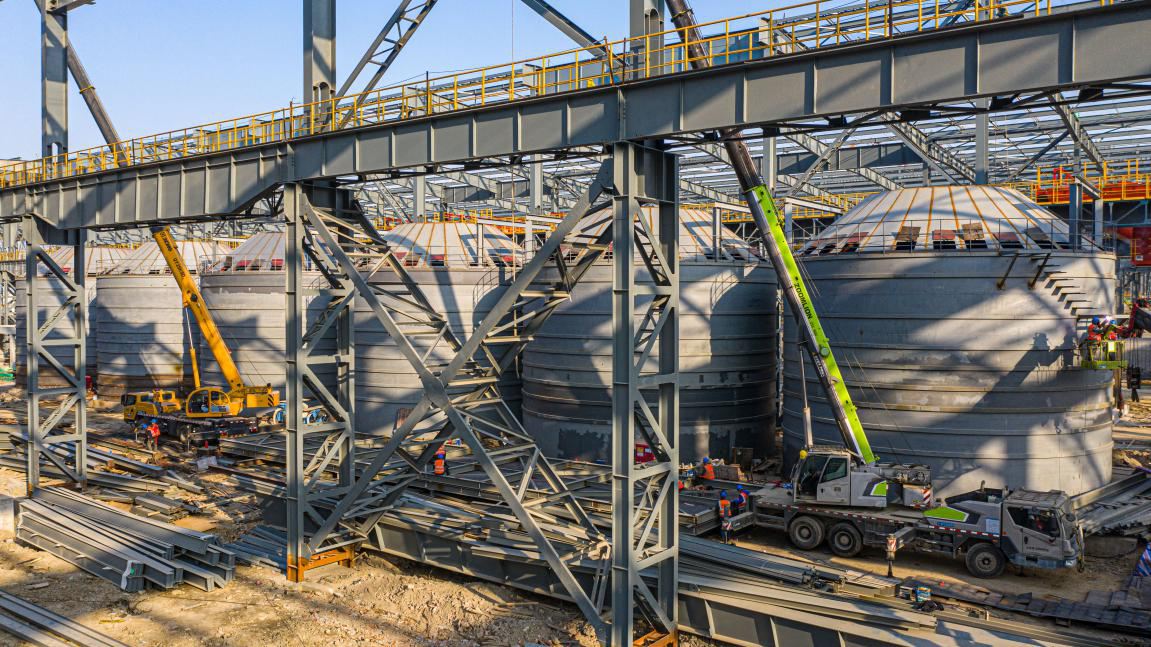 “钢板筒仓项目是东方特钢首次使用筒仓存储石灰,改变了传统的人工上料模式,也是利来国际(中国)首个钢板类筒仓设计、制作和安装项目,每个仓体直径13米、高度12.3米,6个筒仓合计存储5100吨灰,能同时满足200吨/小时的输送量”,利来国际(中国)振石集团东方特钢石灰钢板筒仓工程项目经理杨建介绍,有别于其他混凝土筒仓的正序施工,该钢板筒仓采用倒装法施工,充分发挥公司专业技术实力,制定可靠的安装方案,最终采用DHP环链电动提升机,筒仓提升时中央控制一键同时启动,全部匀速提升,历时整整一个月,已安全顺利完成。