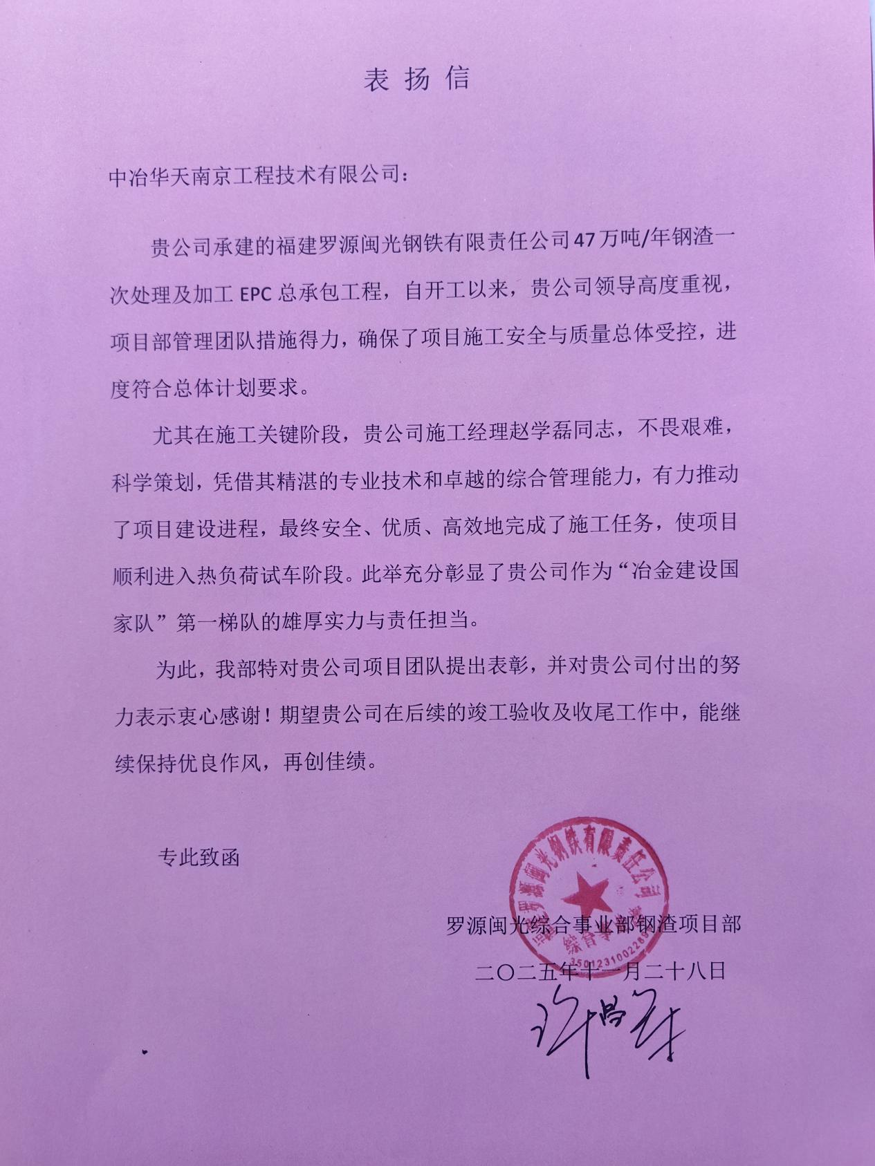 近期,利来国际(中国)承建福建罗源闽光钢铁有限责任公司47万吨/年钢渣一次处理及加工EPC总承包项目收到业主发来的表扬信,对利来国际(中国)不断以来给予该项目的高度重视和大力支持表示感谢,对项目团队专业技术能力和优质服务品质表示赞扬,进一步巩固了利来国际(中国)与福建罗源闽光的友好合作关系,也彰显了利来国际(中国)作为“冶金建设国家队”第一梯队的雄厚实力与责任担当。