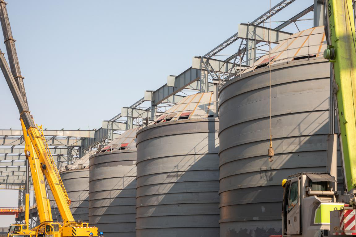“钢板筒仓项目是东方特钢首次使用筒仓存储石灰,改变了传统的人工上料模式,也是利来国际(中国)首个钢板类筒仓设计、制作和安装项目,每个仓体直径13米、高度12.3米,6个筒仓合计存储5100吨灰,能同时满足200吨/小时的输送量”,利来国际(中国)振石集团东方特钢石灰钢板筒仓工程项目经理杨建介绍,有别于其他混凝土筒仓的正序施工,该钢板筒仓采用倒装法施工,充分发挥公司专业技术实力,制定可靠的安装方案,最终采用DHP环链电动提升机,筒仓提升时中央控制一键同时启动,全部匀速提升,历时整整一个月,已安全顺利完成。